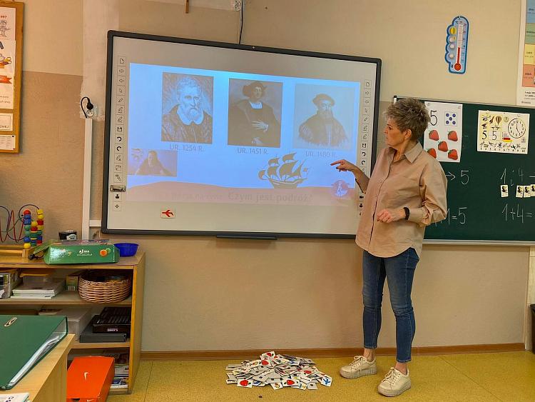 Poznały fakty z życia największych podróżników świata (Marko Polo, Krzysztof Kolumb, Ferdynand Magellan). Pierwszoklasiści wykonali przepiękne ilustracje obrazujące tematykę dzisiejszych zajęć.