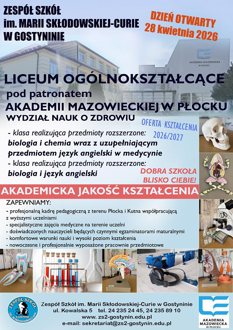 W nadchodzącym roku szkolnym Zespół Szkół im. Marii Skłodowskiej-Curie w Gostyninie przygotował dla absolwentów szkół podstawowych wyjątkową ofertę edukacyjną. W roku szkolnym 2026/2027 szkoła prowadzi nabór do dwóch klas Liceum Ogólnokształcącego pod patronatem Akademii Mazowieckiej w Płocku Wydział Nauk o Zdrowiu.