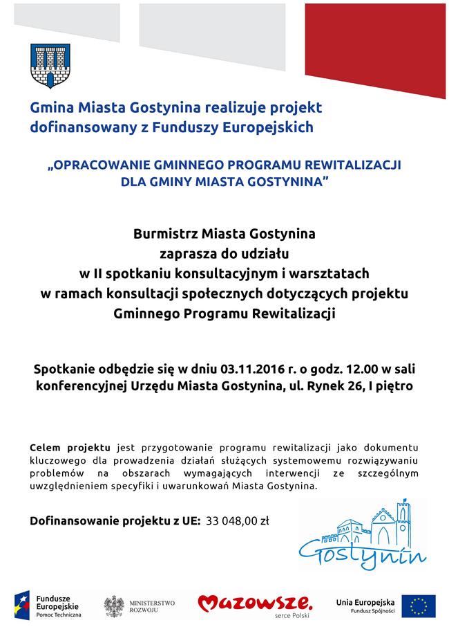 Burmistrz Miasta Gostynina serdecznie zaprasza mieszkańców Gostynina do udziału w II spotkaniu konsultacyjnym i warsztatach w ramach konsultacji społecznych dotyczących projektu Gminnego Programu Rewitalizacji. Spotkanie odbędzie się w dniu 3 listopada 2016 r. o godz. 12.00 w sali konferencyjnej Urzędu Miasta Gostynina, ul.Rynek 26, I piętro.