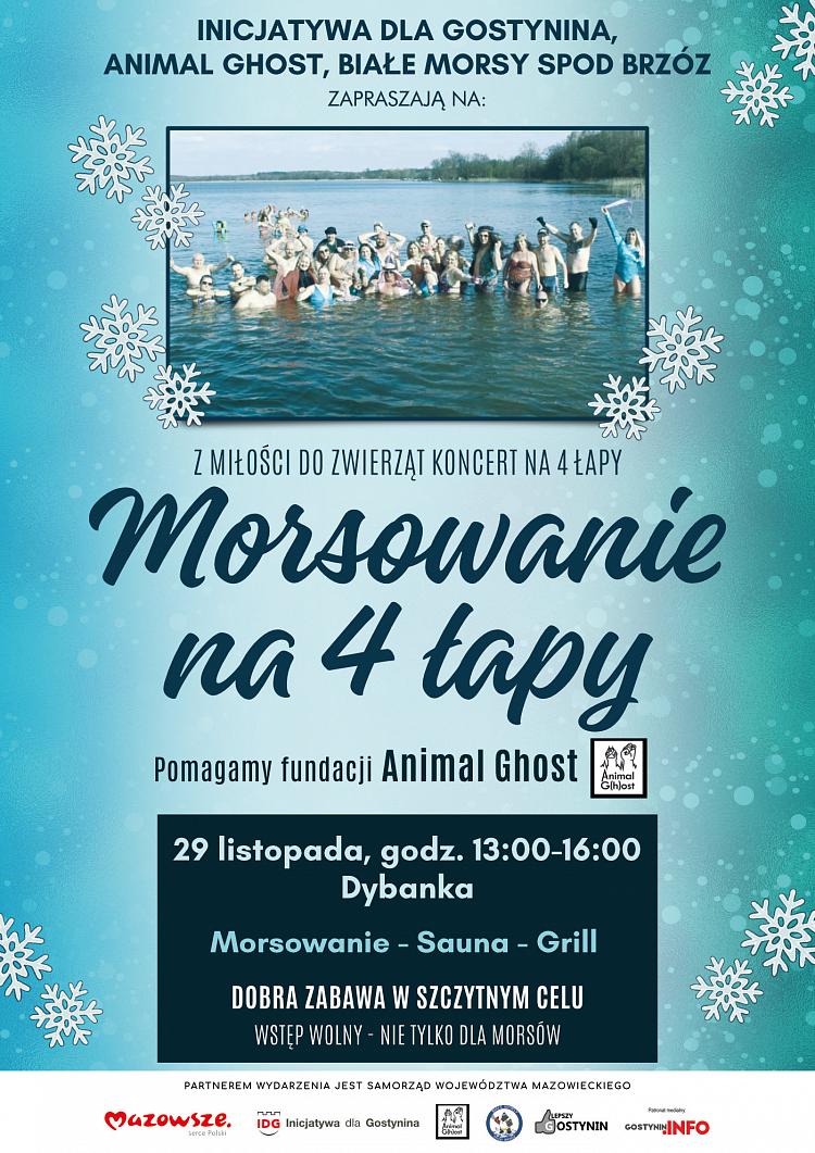 Inicjatywa dla Gostynina, fundacja Animal Ghost oraz Białe Morsy spod Brzóz zapraszają na morsowanie połączone z pomocą zwierzętom ze schronisk. W sobotę, 29 listopada, na kąpielisku Dybanka odbędzie się „Morsowanie na 4 łapy" – z miłości do zwierząt koncert na 4 łapy.