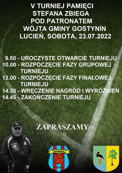 W sobotę, 23 lipca 2022 r. na boisku w Lucieniu zostanie rozegrany V Turniej pamięci Stefana Zbiega pod patronatem Wójta Gminy Gostynin.
