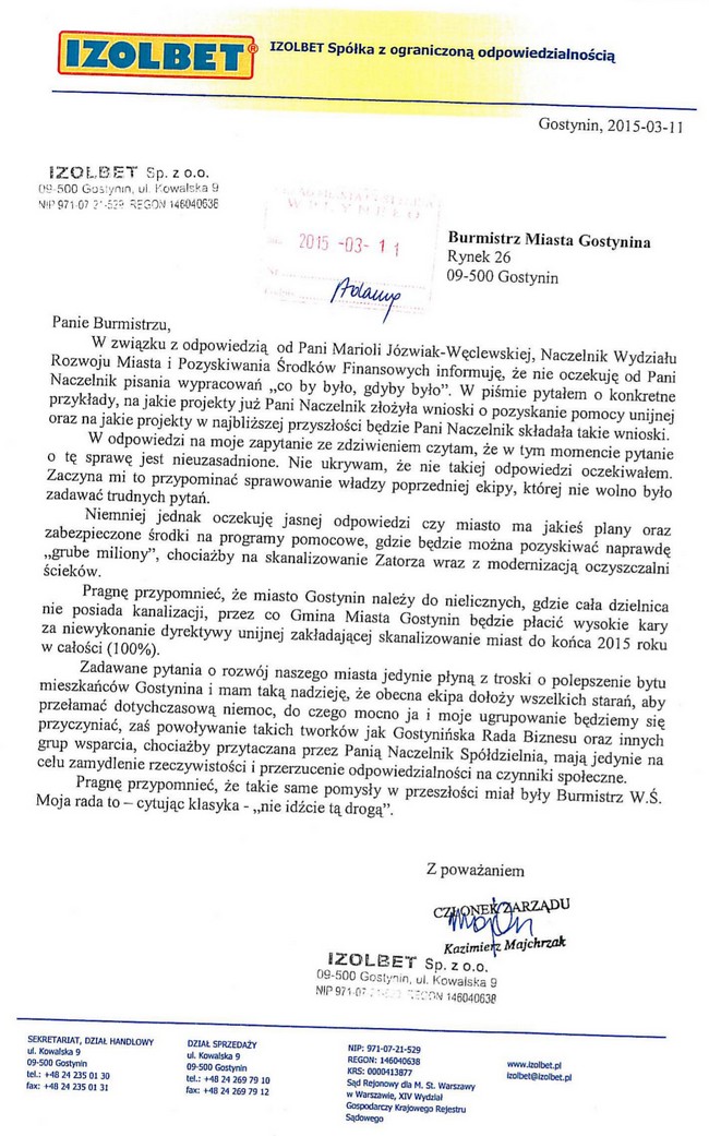 Przypomina również o braku kanalizacji na Zatorzu. Problem jest bardzo poważny, gdyż w przypadku nieskanalizowania w/w dzielnicy do końca 2015 roku kosztami za niewypełnienie dyrektyw unijnych zostanie obciążona Gmina Miasta Gostynina.