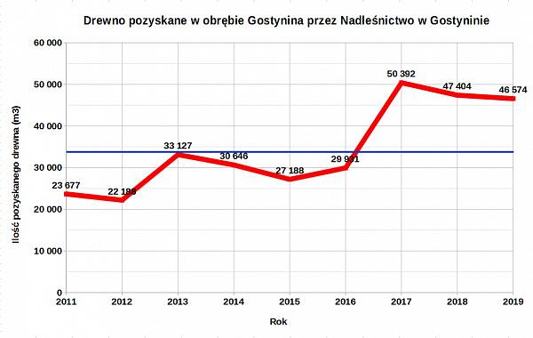 Rok 2020 dla obrębu leśnego Gostynin to nadal wysoka ilość pozyskanego drewna w porównaniu do czasów kiedy nie rządził PIS. Jak podaje Nadleśnictwo Gostynin w 2020 roku pozyskano ponad 41 tyś. m3 drewna. Jak wyglądała sytuacja w latach poprzednich pokazuje wykres poniżej.