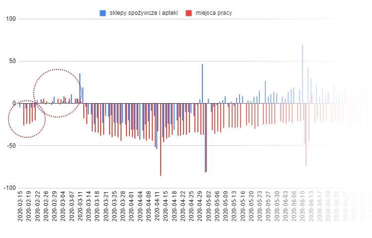 Na wykresach czerwonymi słupkami oznaczone są zmiany mobilności w miejscach pracy a niebieskim w sklepach spożywczych i aptekach.