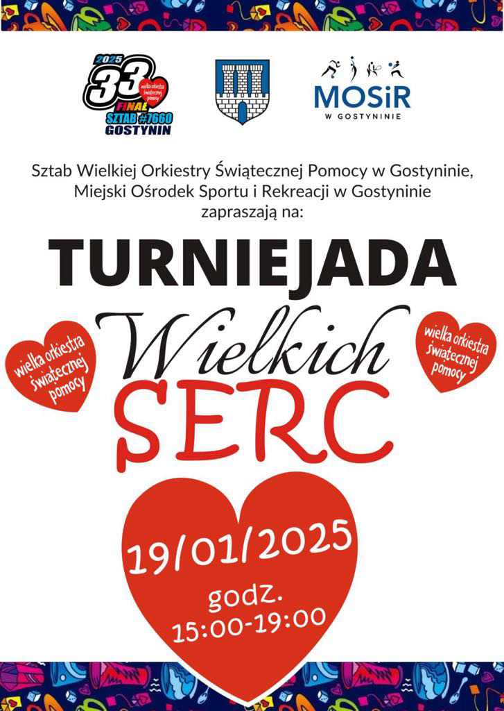 Już wkrótce Gostynin ponownie rozgrzeje się w rytmie Wielkiej Orkiestry Świątecznej Pomocy! Sztab WOŚP Gostynin #7660, we współpracy z MOSiR Gostynin, zapraszają wszystkich mieszkańców na wyjątkowe wydarzenie – Turniejadę Wielkich Serc. To doskonała okazja, by połączyć sportową rywalizację z szczytnym celem, jakim jest wsparcie 33. Finału WOŚP.