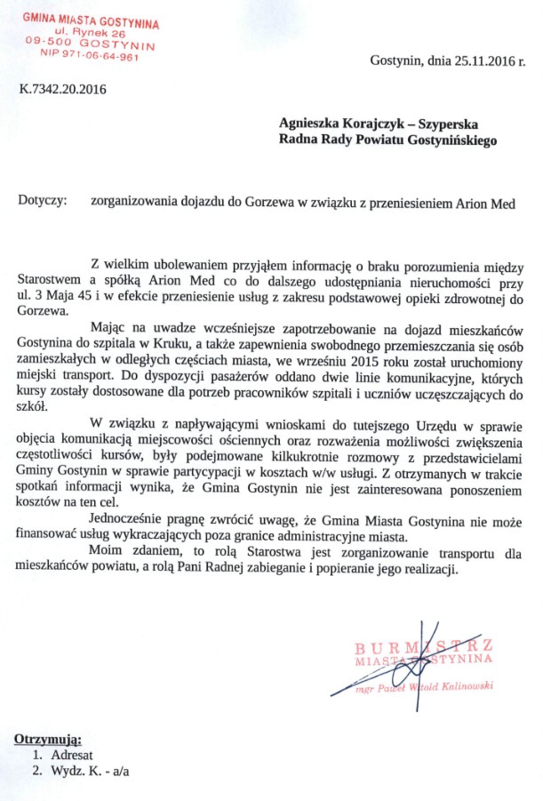 "Cieszę się, że Burmistrz pomimo wymijającej odpowiedzi na mój wniosek uwzględnił moją prośbę i innych składających w tej sprawie wnioskodawców i podpisał umowę na zwiększenie kursów do szpitala." - komentuje rozwiązanie sytuacji Korajczyk-Szyperska.