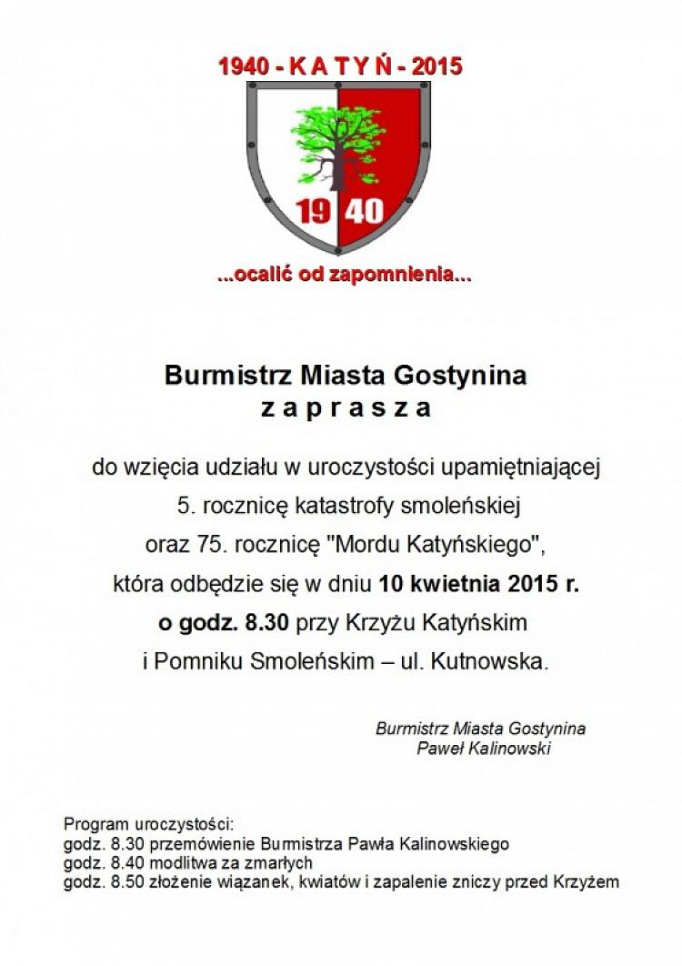 Burmistrz Miasta Gostynina Paweł Kalinowski zaprasza do wzięcia udziału w uroczystości upamiętniającej 5. rocznicę katastrofy smoleńskiej oraz 75. rocznicę "Mordu Katyńskiego", która odbędzie się 10 kwietnia br.