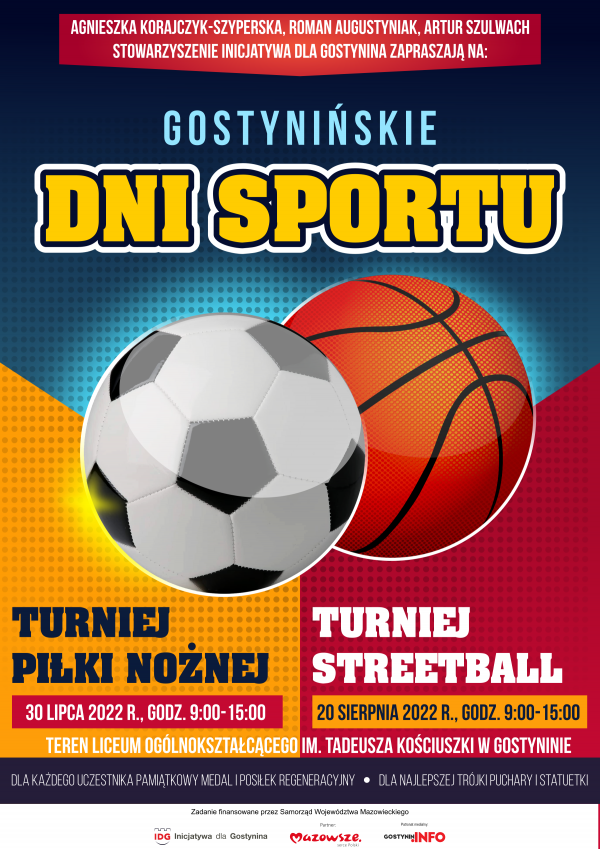 Agnieszka Korajczyk-Szyperska, Roman Augustyniak, Artur Szulwach - Stowarzyszenie Inicjatywa dla Gostynina zapraszają do kibicowania w sobotnim turniej koszykówki ulicznej w ramach Gostynińskich Dni Sportu..