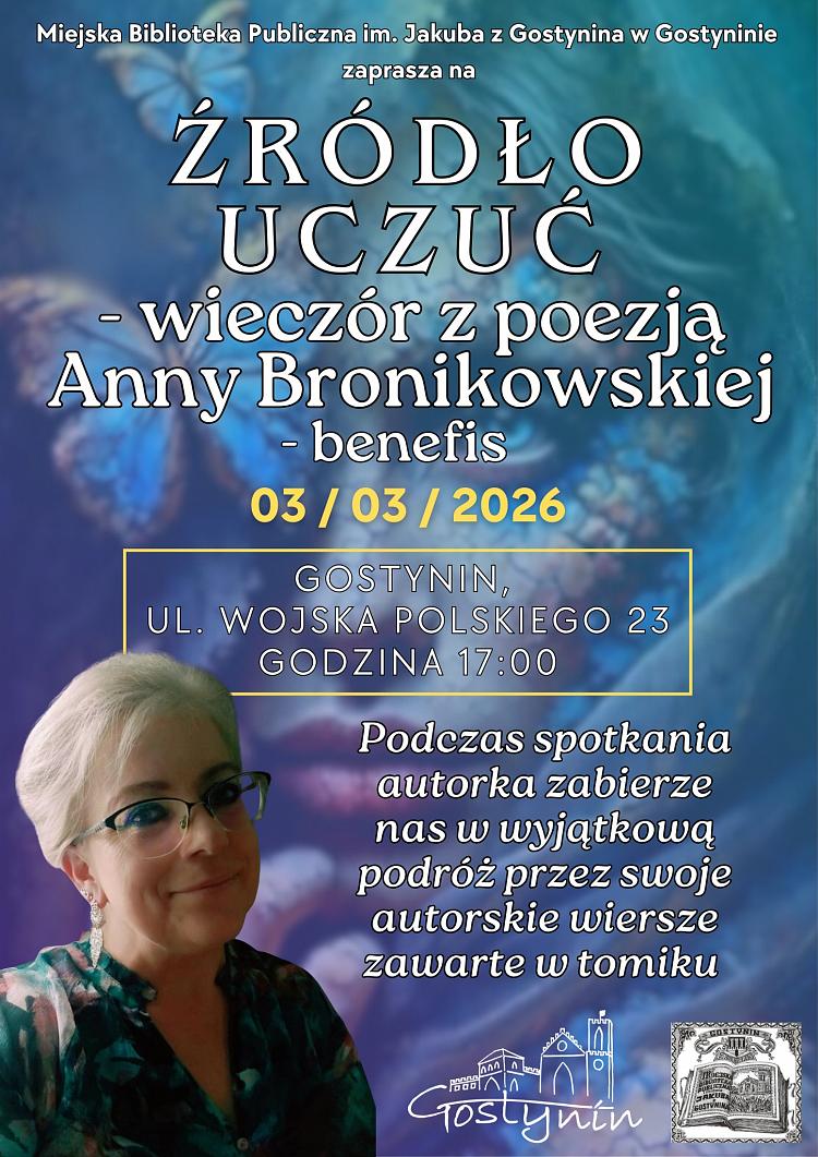 We wtorek, 3 marca, w Miejskiej Bibliotece Publicznej w Gostyninie odbędzie się promocja tomiku poezji Anny Bronikowskiej pt. „Źródło uczuć”. Wydarzenie połączone z benefisem autorki rozpocznie się o godzinie 17:00.