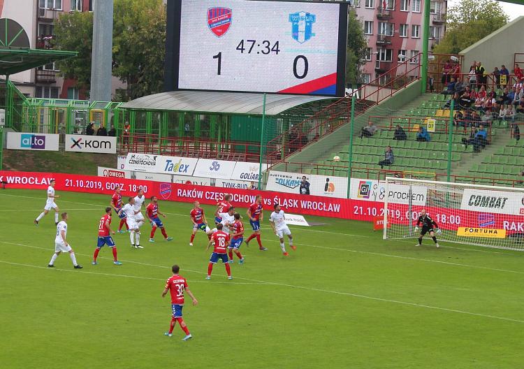 Z tego stałego fragmentu gry gola mógł zdobyć za to Tomáš Petrášek, ale jego uderzenie głową w porę zostało zablokowane. W kolejnej akcji ten sam piłkarz znakomicie odegrał piłkę do wychodzącego za linię naszej defensywy Browna Forbesa. Kostarykanin znalazł się w sytuacji sam na sam z Thomasem Dähne, ale na szczęście pojedynek ten wygrał nasz golkiper. Później świetną interwencją popisał się Alan Uryga, który odważnym wślizgiem odebrał piłkę Brownowi Forbesowi. Niestety pod koniec pierwszej połowy aktywny napastnik dopiął w końcu swego i wyprowadził Raków na prowadzenie. Z prawej strony bardzo dobrą centrę wykonał Michał Skóraś i Brown Forbes popisał się skuteczną główką. Tuż przed przerwą swoim skrzydłem ruszył jeszcze Cezary Stefańczyk, ale po jego wrzutce nieskutecznie główkował Ángel García Cabezali.